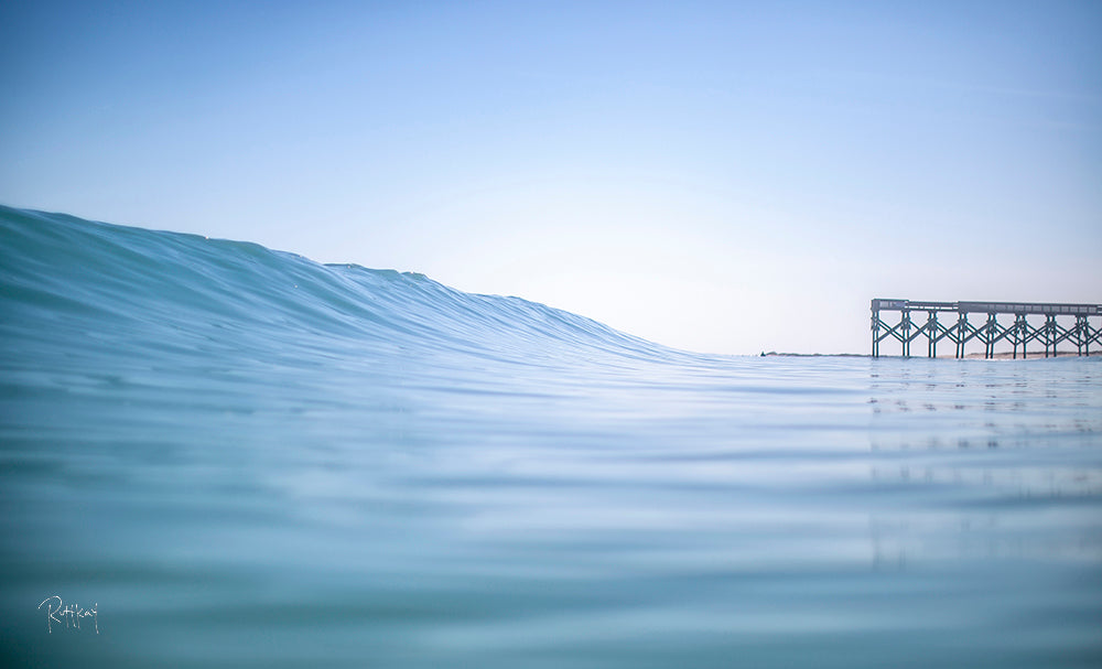 From the heart of a distant August hurricane comes Blue Lumps—a midday vision of precision and calm. Captured from shore at Wrightsville Beach, NC, the piece freezes a perfect pulse of ocean energy. Not a breeze in the air. Just clean, deep-blue swell lines stacking like liquid architecture.